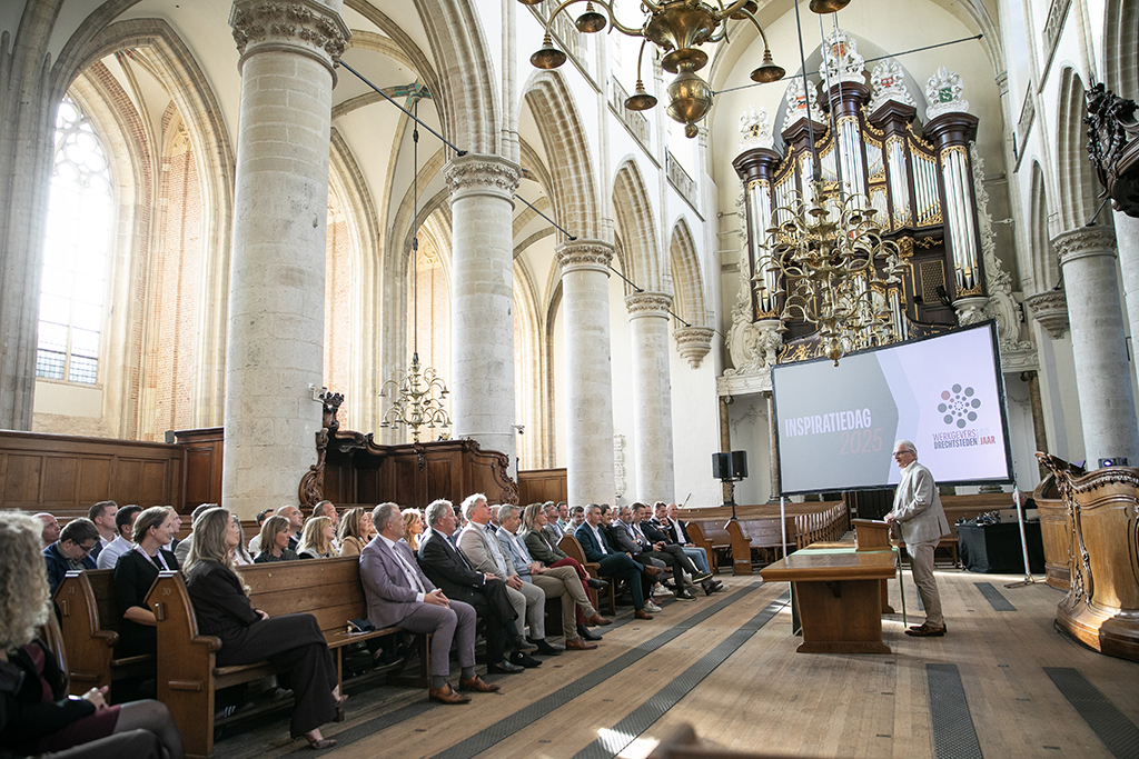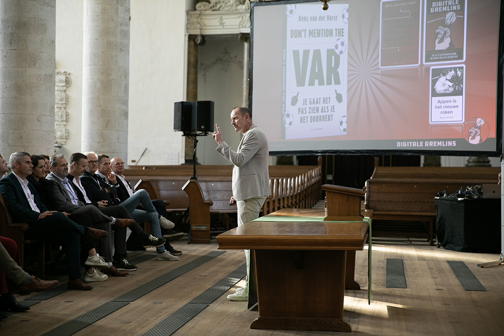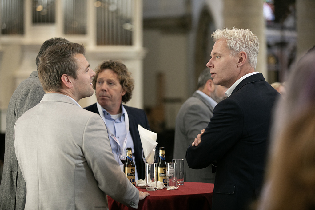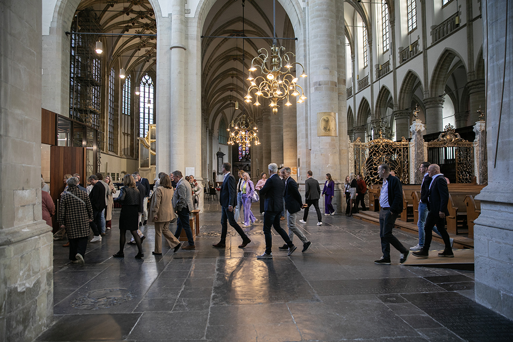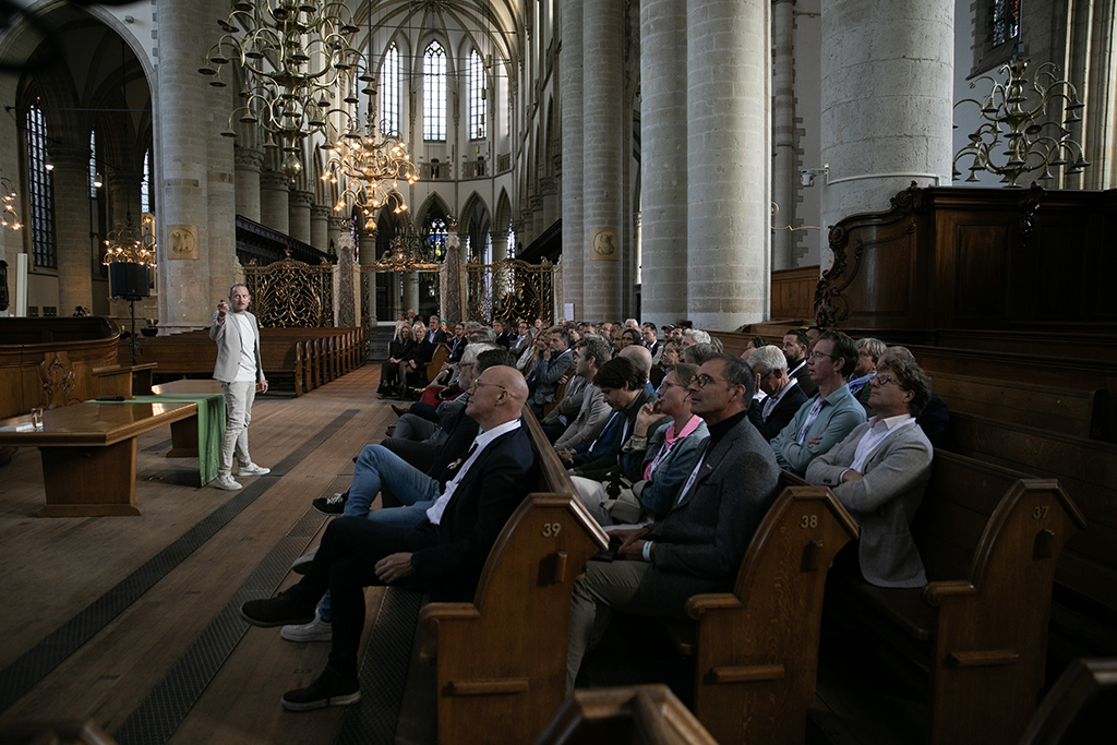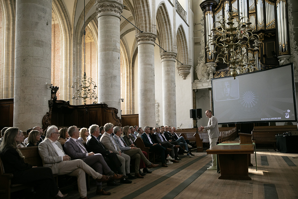 Na het sportieve gedeelte verplaatsten we ons naar De Grote Kerk in Dordrecht, waar een indrukwekkend filmpje werd vertoond over de historie van de kerk en haar rol in de hedendaagse maatschappij. De eeuwenoude muren vormden het decor voor een moderne dialoog over technologie en zingeving. Rens van der Vorst, technofilosoof, gaf een humoristische en prikkelende les in bewustzijnsontwikkeling. Hij maakte ons op originele wijze bewust van hoe we techniek moeten benutten om meer mens te zijn – en te blijven. Zijn verhaal zette aan tot nadenken over de rol van technologie in ons leven en hoe we deze kunnen inzetten met oog voor menselijkheid en ethiek.