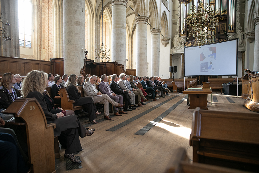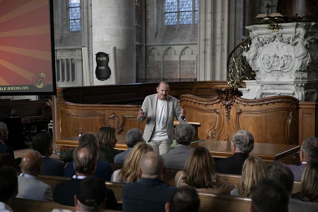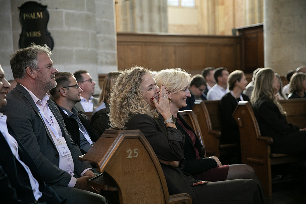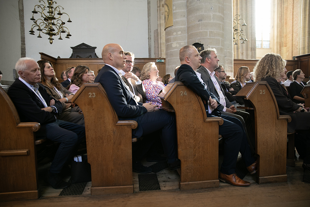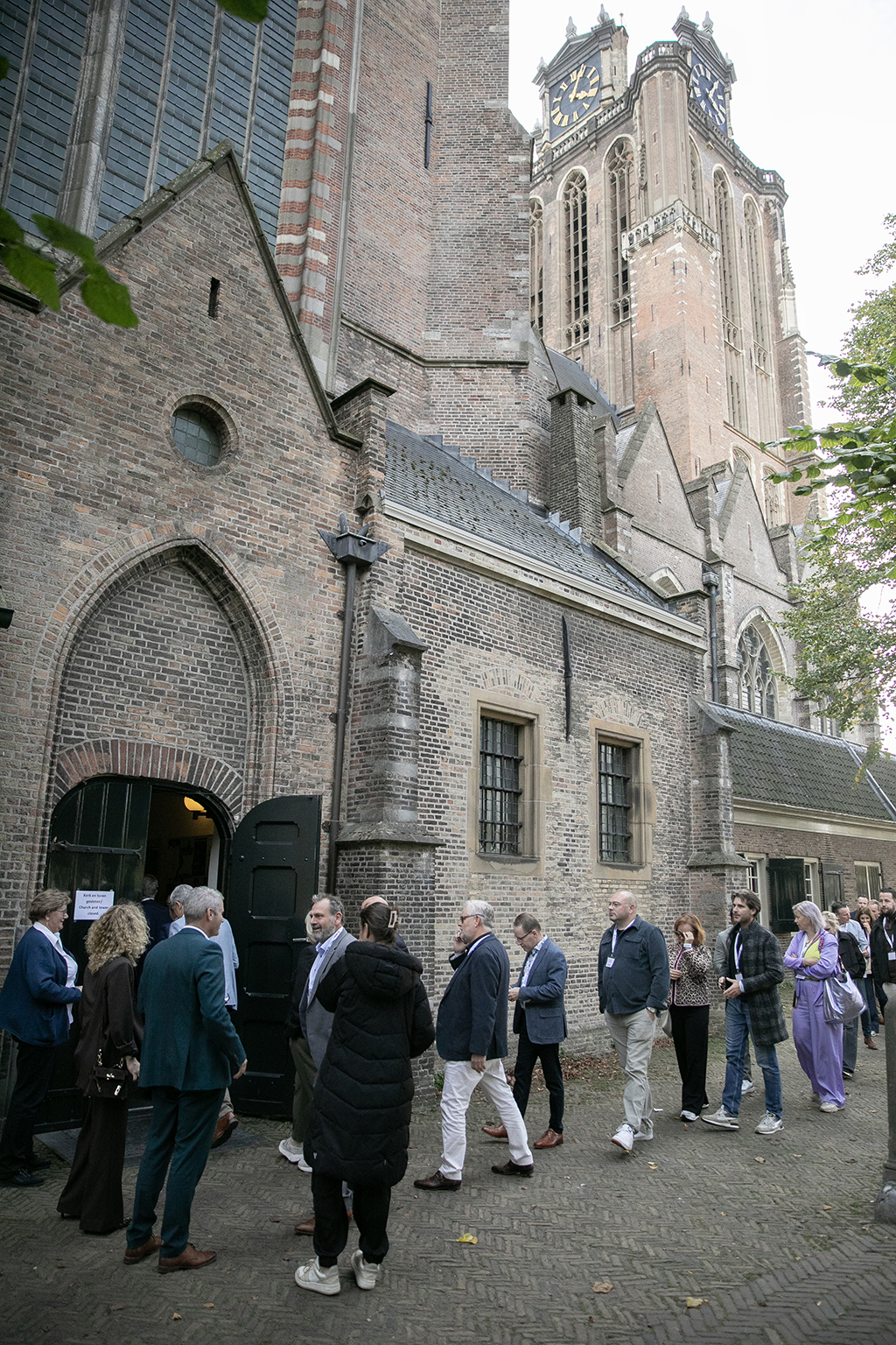 Na het sportieve gedeelte verplaatsten we ons naar De Grote Kerk in Dordrecht, waar een indrukwekkend filmpje werd vertoond over de historie van de kerk en haar rol in de hedendaagse maatschappij. De eeuwenoude muren vormden het decor voor een moderne dialoog over technologie en zingeving. Rens van der Vorst, technofilosoof, gaf een humoristische en prikkelende les in bewustzijnsontwikkeling. Hij maakte ons op originele wijze bewust van hoe we techniek moeten benutten om meer mens te zijn – en te blijven. Zijn verhaal zette aan tot nadenken over de rol van technologie in ons leven en hoe we deze kunnen inzetten met oog voor menselijkheid en ethiek.